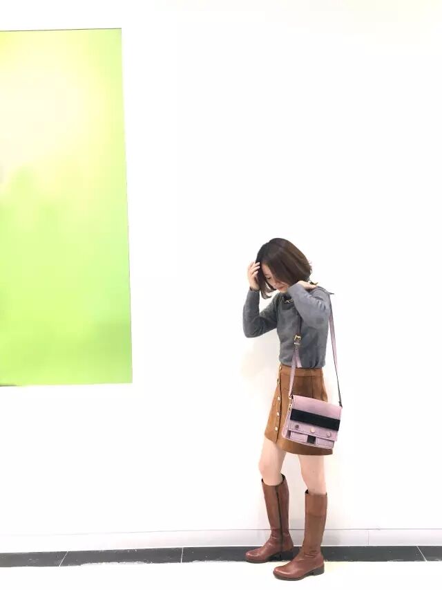 正红色毛衣与深棕色Tote再加上军绿色长裤,反正在冬天很耀眼哦!短上衣加上宽松锥形裤也是显高显瘦的秘诀~
