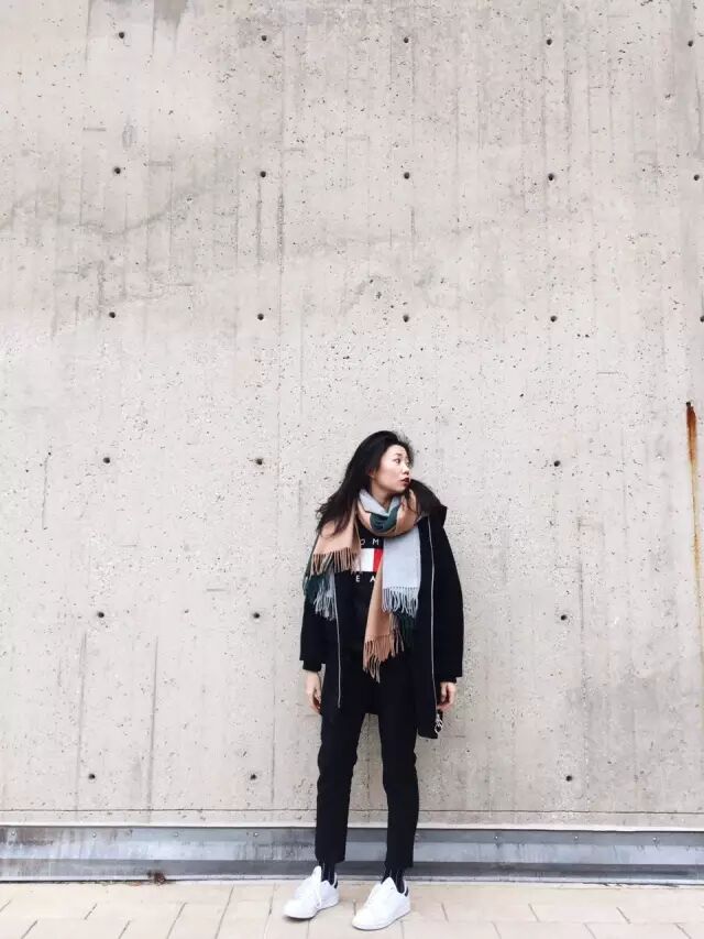 粉色毛衣撞天蓝,感觉自己重回18岁啊。围巾也是浅粉色,起到一个过渡调和作用。上半身色彩太激烈了,下半身就用万能黑色压一压,还显瘦~