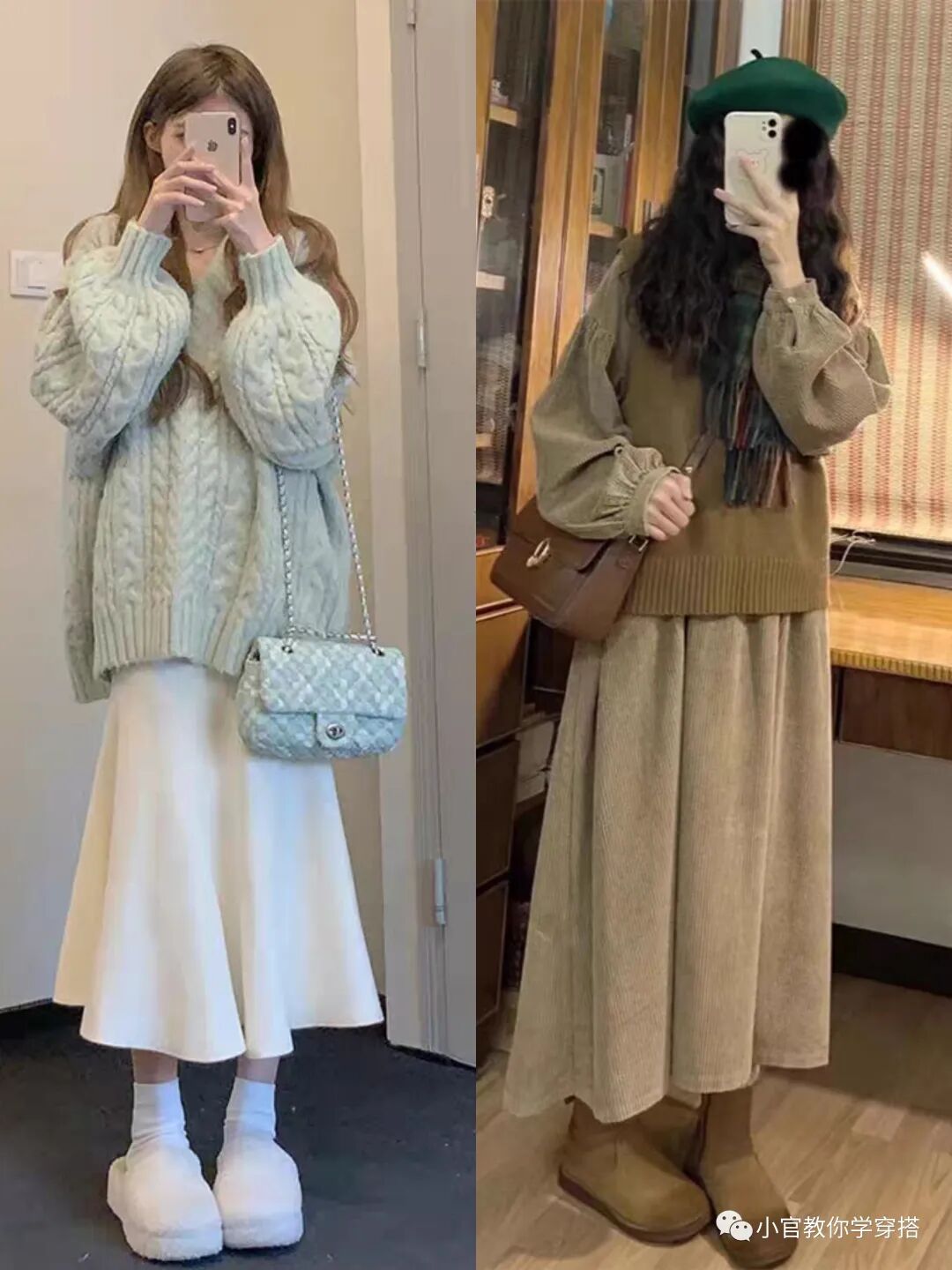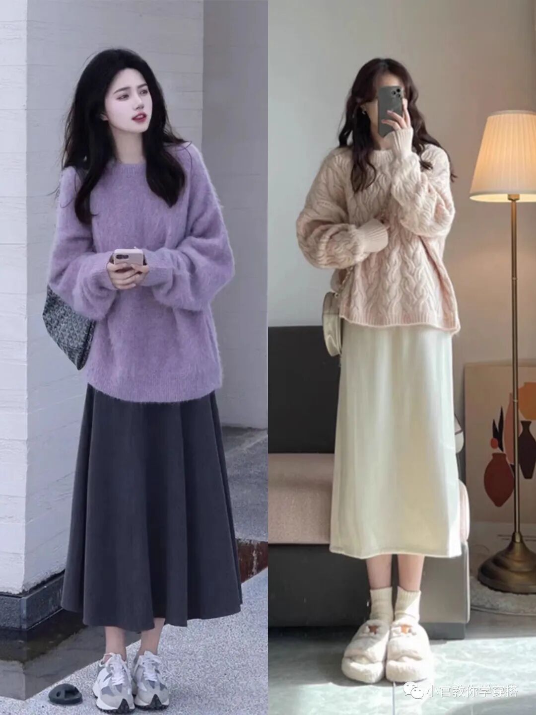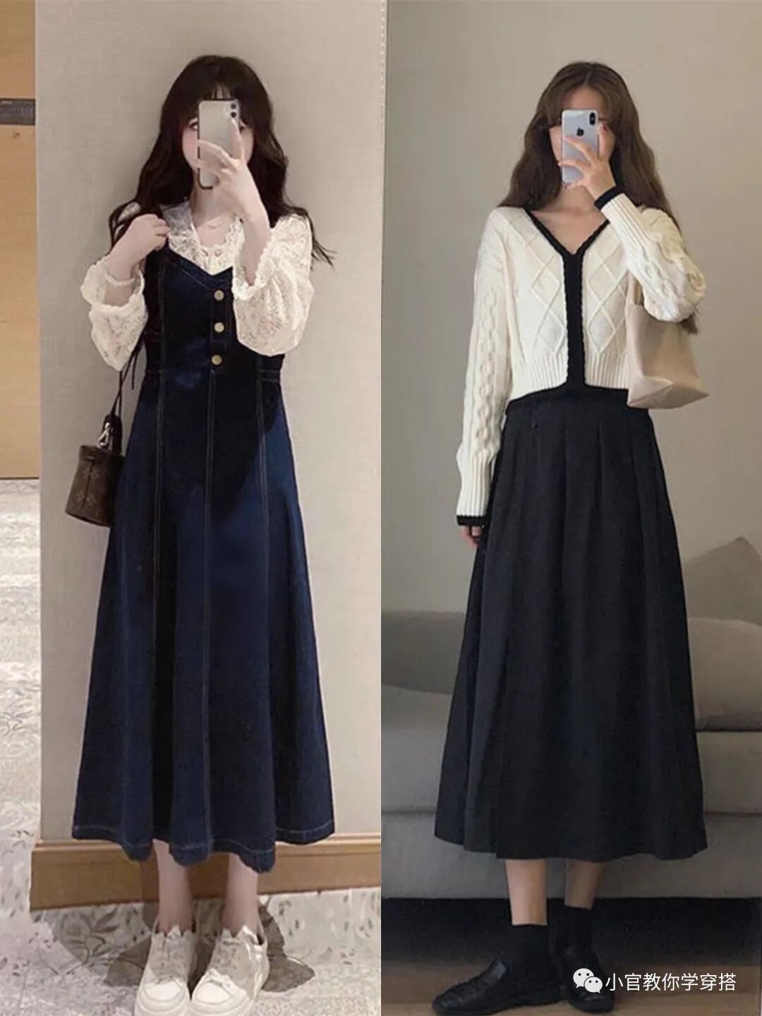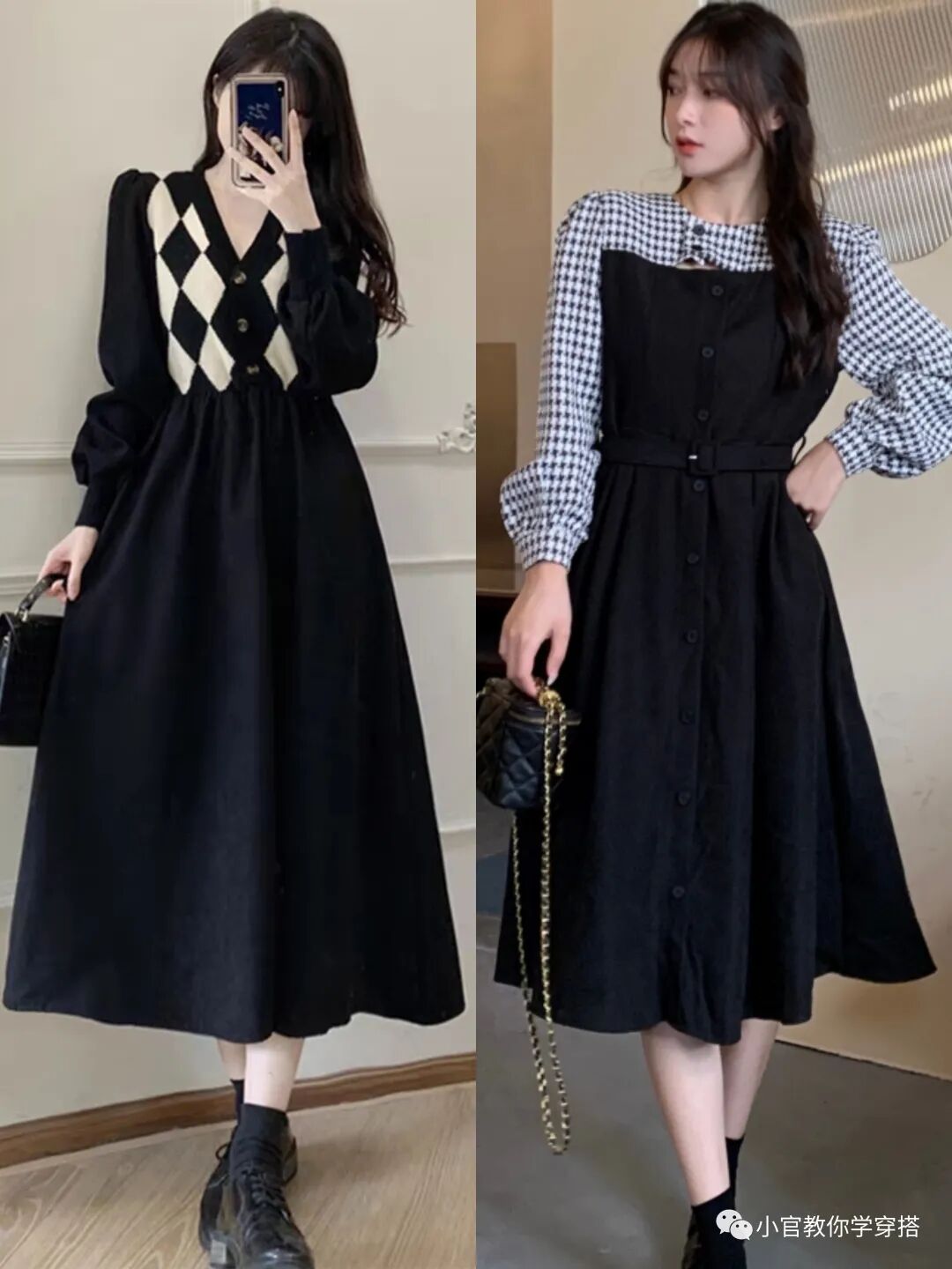 这里经典的黑白配,虽然简约,但是很多人穿不出整体效果,那么你可以不满足整体穿搭效果,白色针织衫上衣搭配黑色连衣裙或者黑色半身裙,就能让你穿搭更出彩。