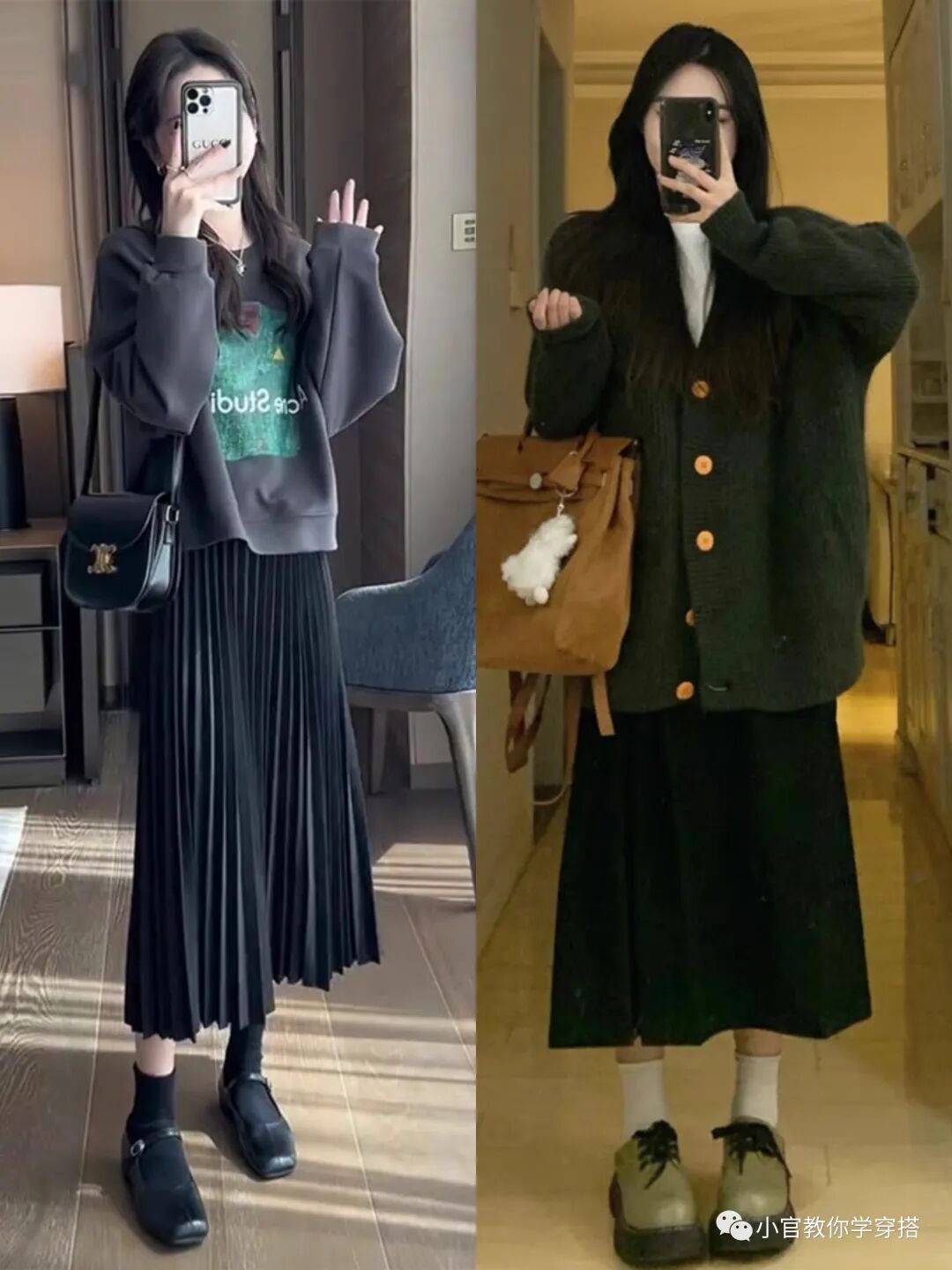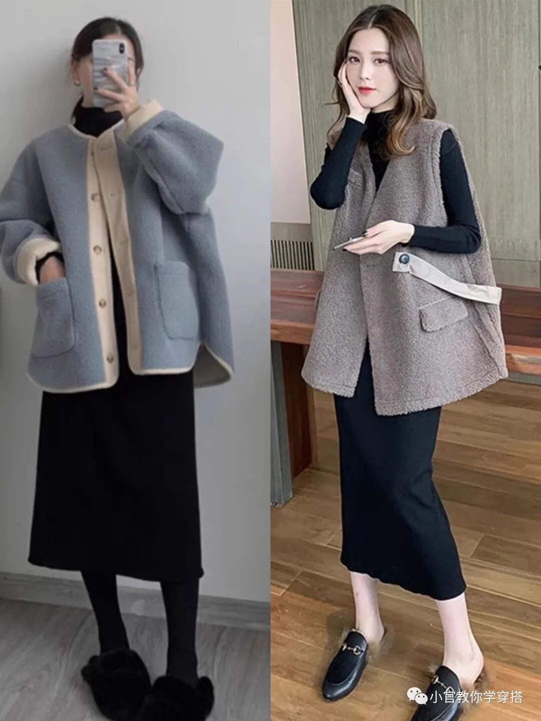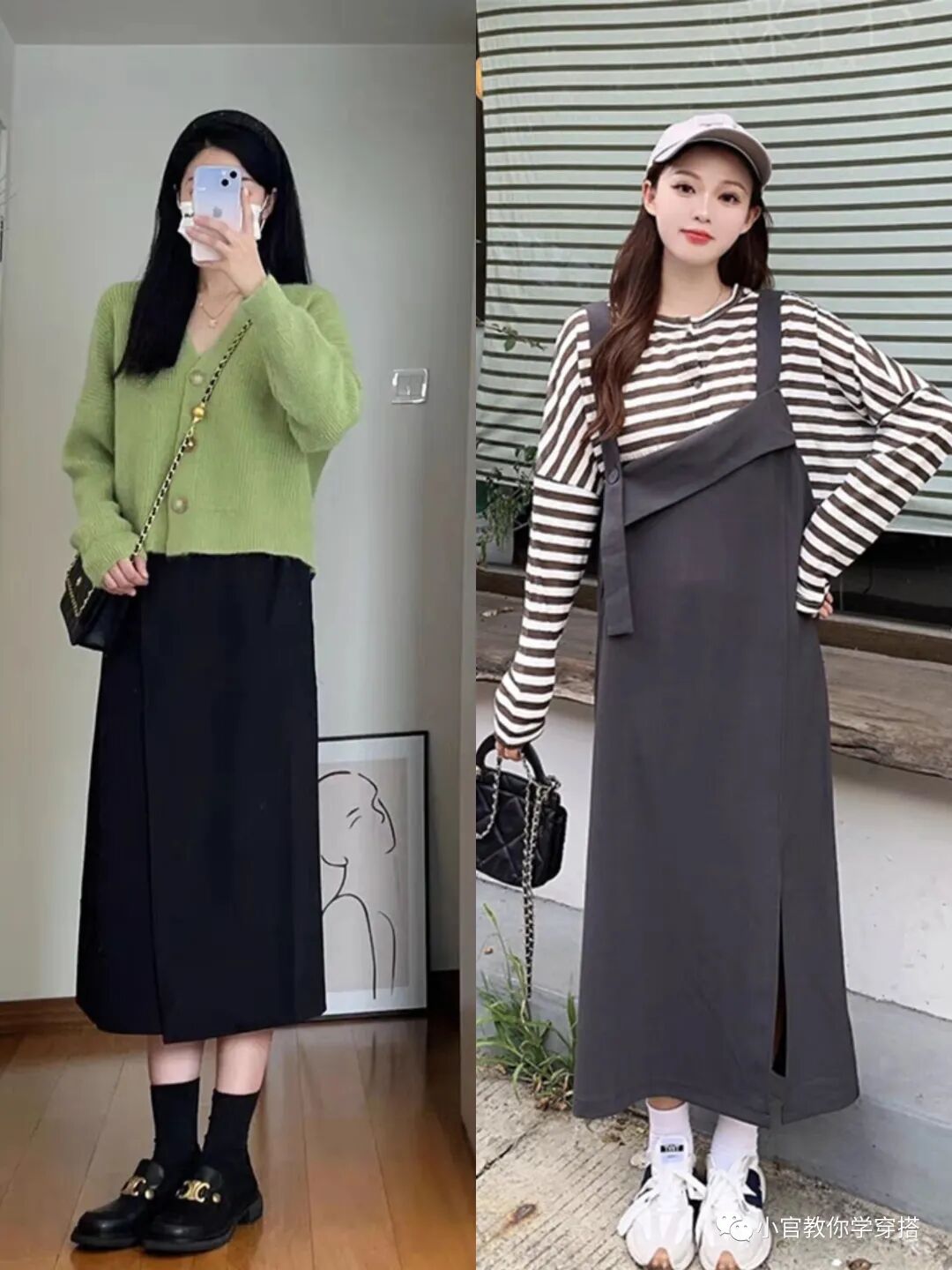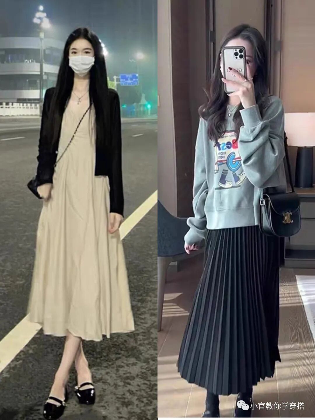 如果担心针织衫太长,那么你可以试一下上短下长的穿搭法则,抬高腰线使得下身更加修长,用短款针织衫搭配黑色连衣裙即保暖又品味气质。