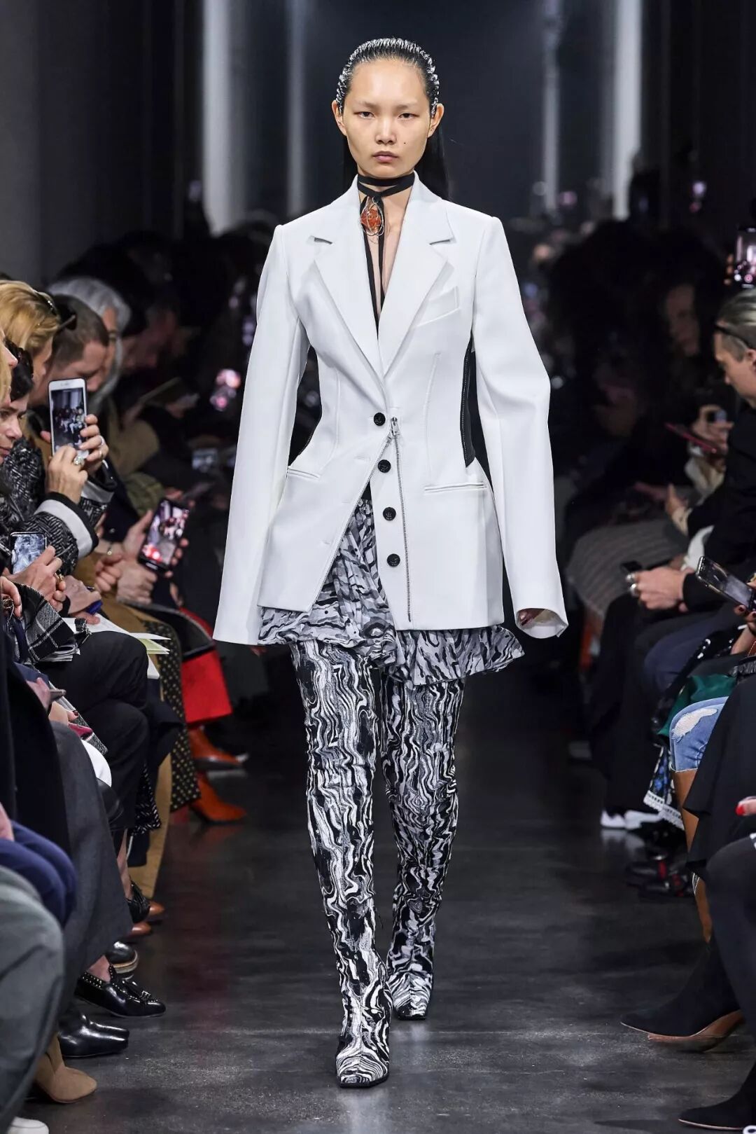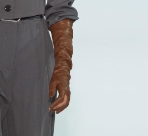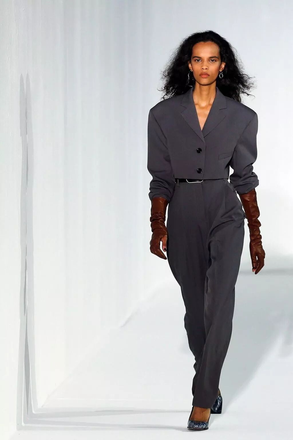 Acne 这次也出现了西装外套,但它不同于Mugler。Acne的上身西装是短款,并且搭配了同系列的西裤,而手套当然也加入了亮面皮革元素,整体就给人一种干练感 ▼