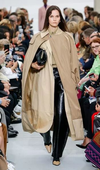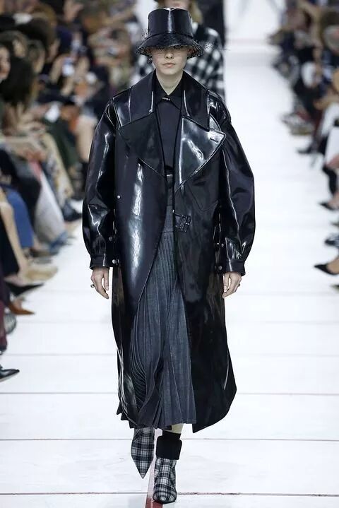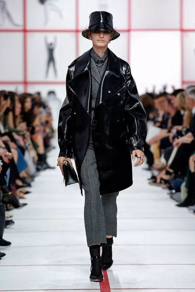 Dior 在巴黎秋冬时尚时装周中,不仅出现亮面皮革的大衣和防雨斗帽 ,下身还搭配了宽松的裤子,完美的将冬天的光泽感呈现出来。▼