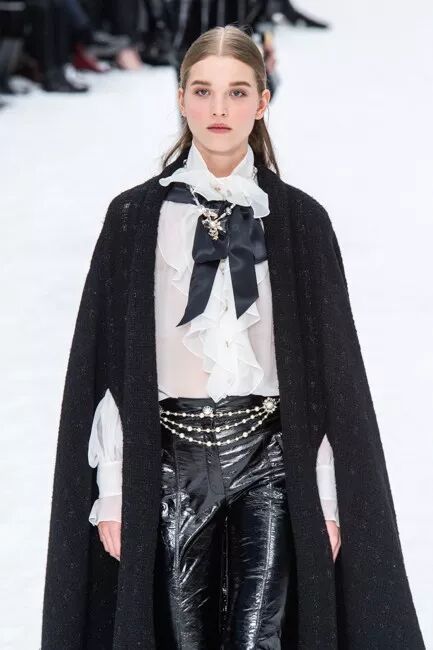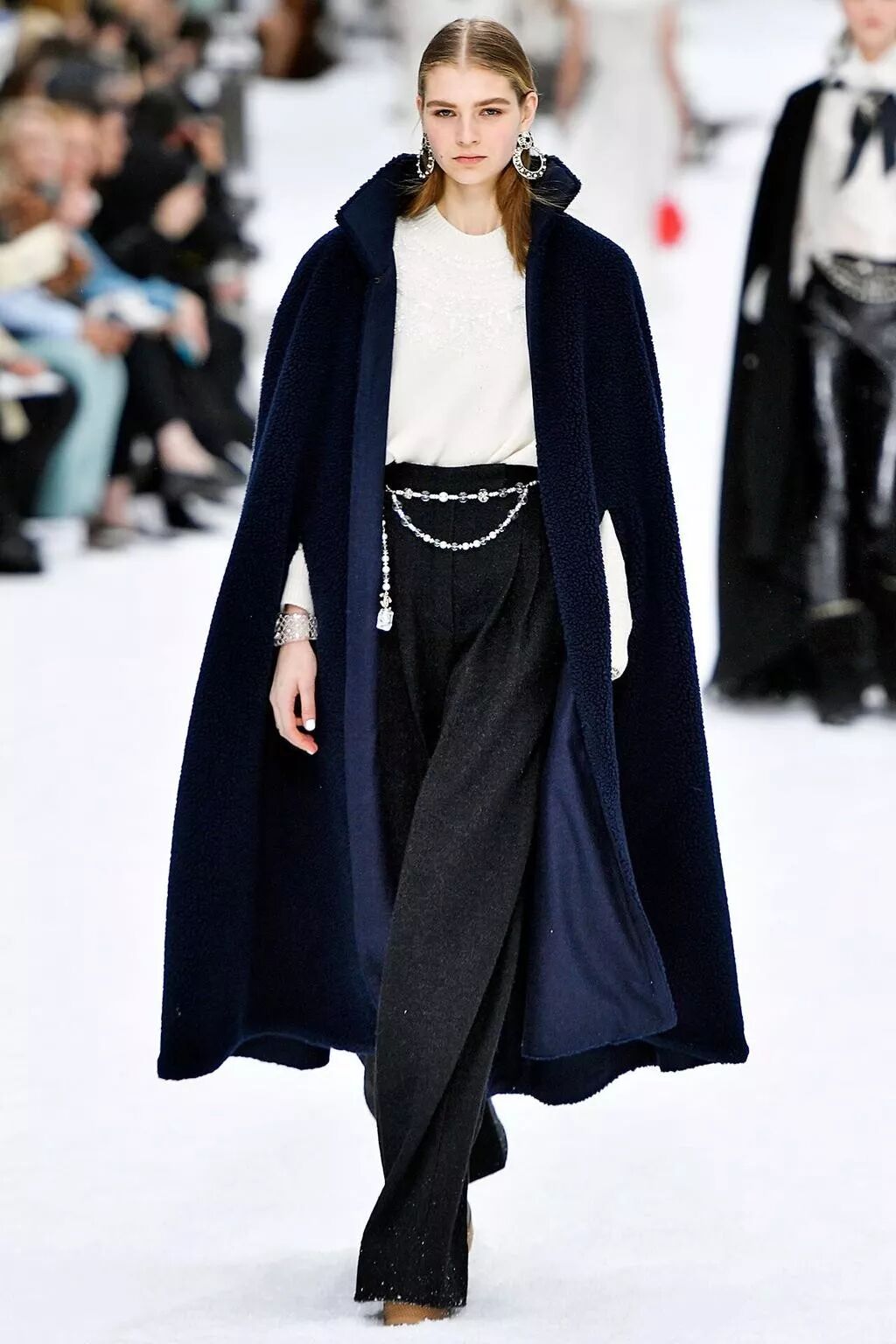 Chanel 的这件斗篷披肩被称为“新时代的斗篷”,以稳重的深色色系为主,内搭白色毛衣,简约又不失稳重,就算佩戴夸张的耳环也不会过,刚好 ▼