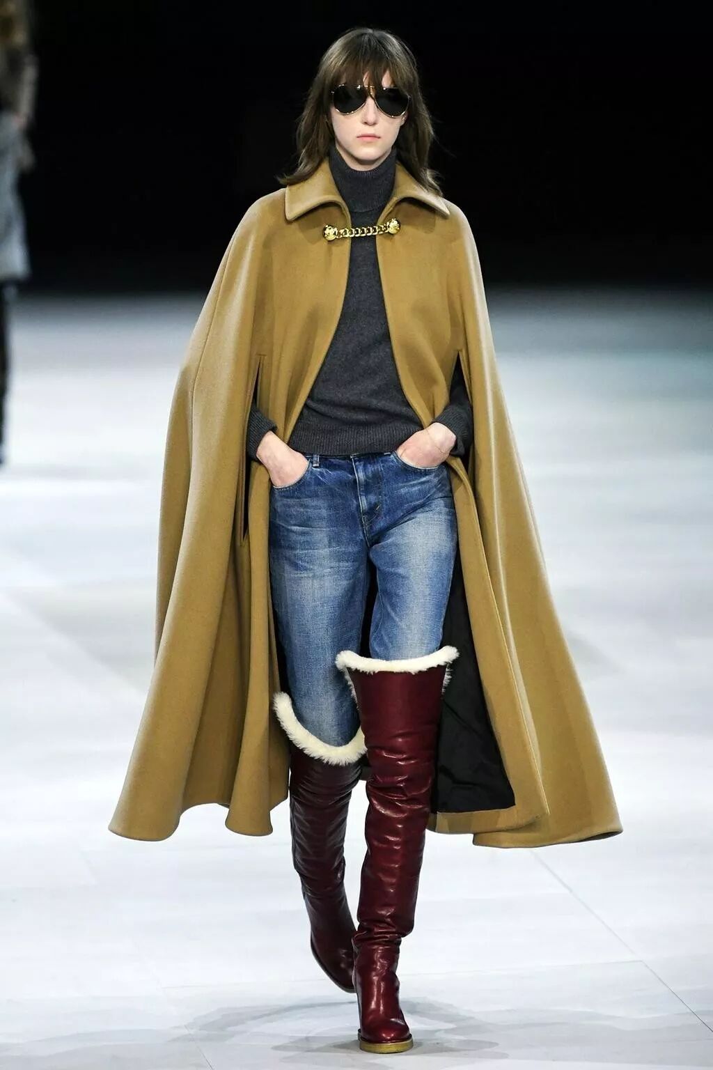 Celine 这两件驼色斗篷大衣在冬天穿特别显气色,(左一)并毫不动摇的在衣领放上一条可弯曲的金色链环,并搭配牛仔裤和红色亮面的长靴,竟然没有一丝违和感 ▼