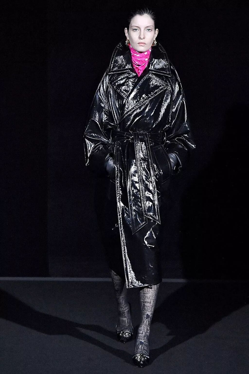 Balenciaga 在巴黎秋冬时装周中,大衣采用了亮面的黑色皮革,搭配自家经典款的尖头鞋, (左一)在深色色系中戴上玫红色的波点丝巾,强中带柔,低调又不失活力。▼