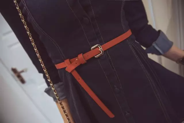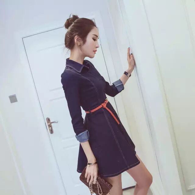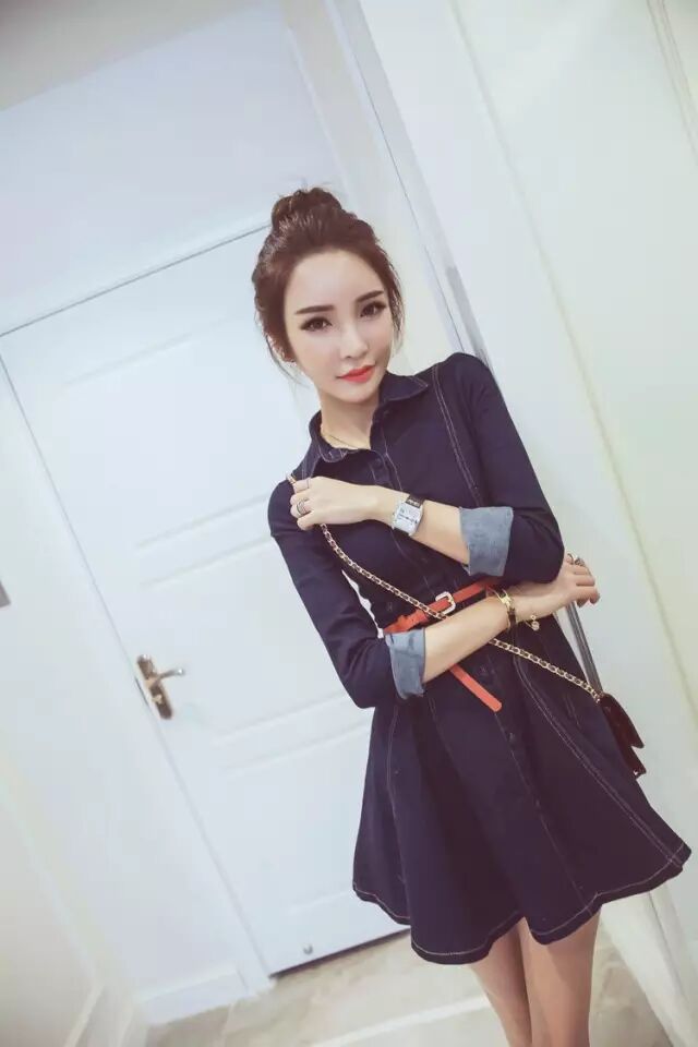 约会穿搭推荐唐家欧美 时尚OL 气质修身 翻领收腰长袖A字牛仔连衣裙 带腰带