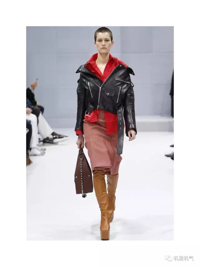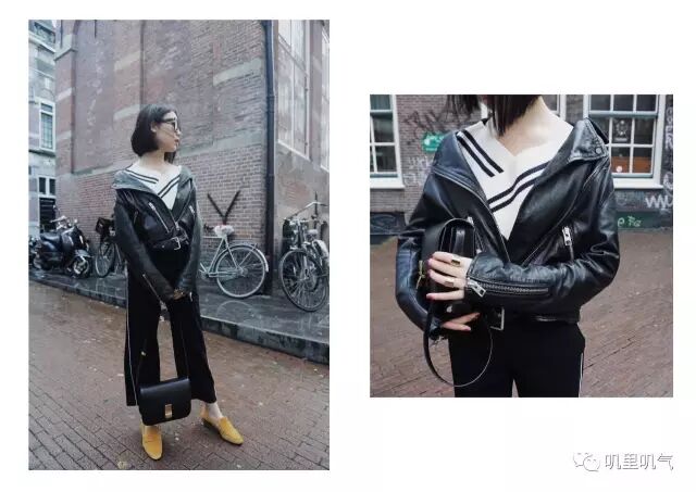 我借鉴了Balenciaga 2016秋冬的秀场搭配,把皮衣落肩穿,打破了沉闷的黑白搭配的同时,也增添了点趣味。