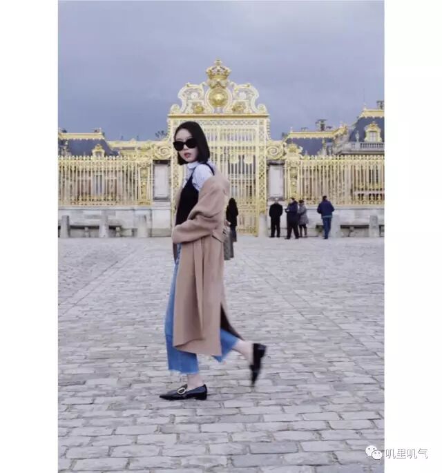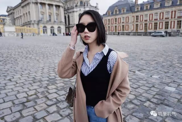 (驼色大衣:Max Mara Weekend | 黑色毛衣背心:Zara Studio | 蓝色条纹衬衣:Juddrey | 牛仔裤:MO&CO|鞋子:Prada | 包包:Gucci)
