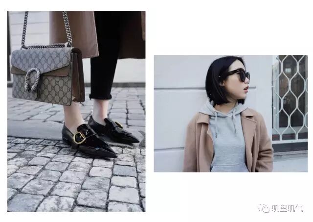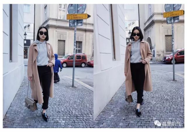 (驼色大衣:Max Mara Weekend | 灰色卫衣:Topshop | 裤子:Low Classic | 包包:Gucci | 鞋子:Prada | 墨镜:Celine)