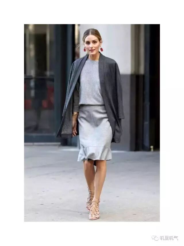 Olivia Palermo就选择了灰色色系中两个落差比较大的颜色去搭配,既不显胖又有层次感。红色的耳环也恰到好处,不会抢了整套outfit的风头。