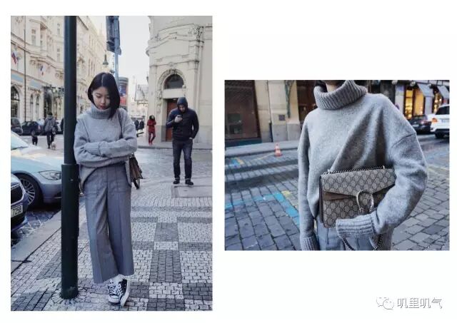 (灰色高领毛衣:&other stories | 裤子:Urban Outfitters | 包包:Gucci | 鞋子:Converse)