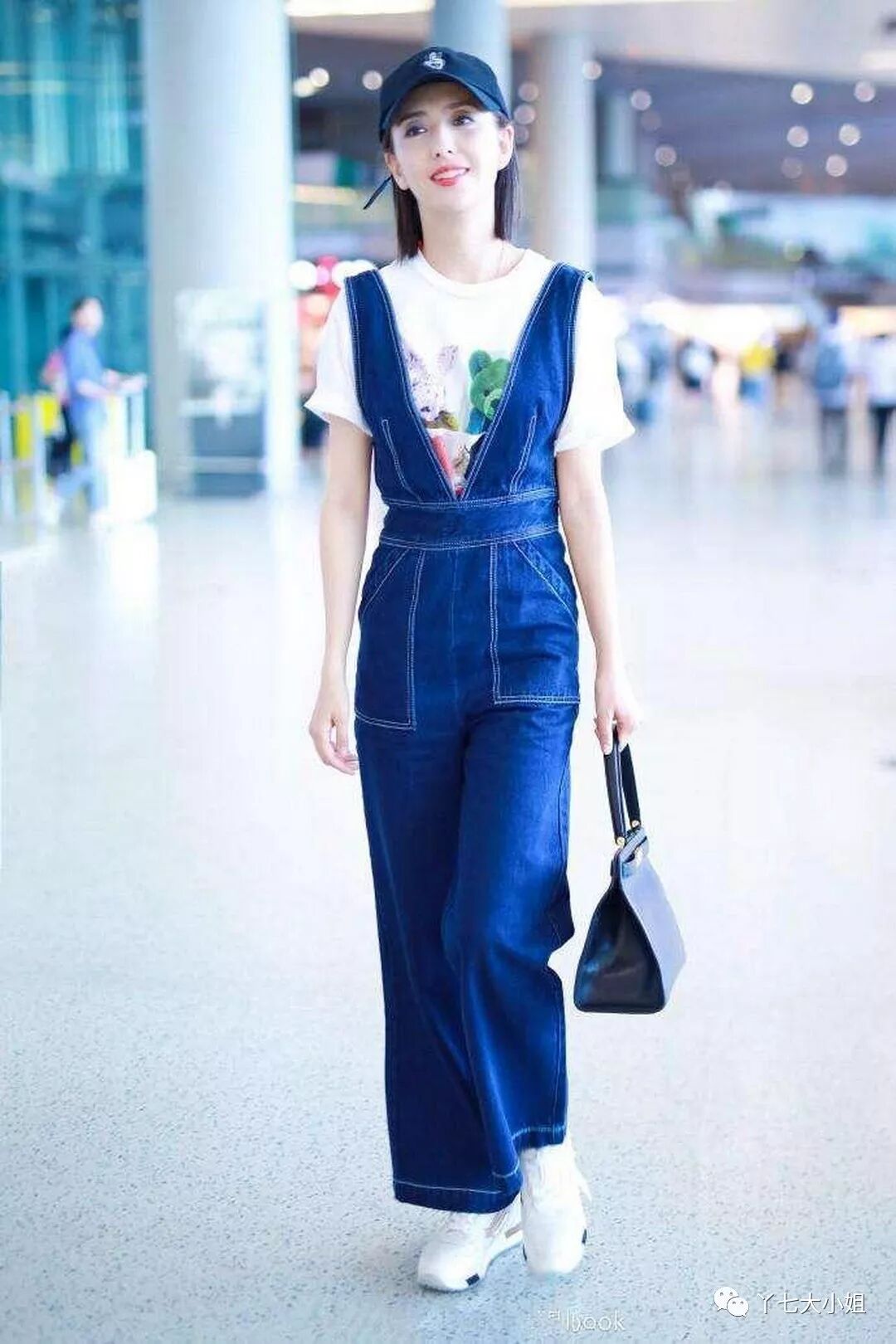 佟丽娅的牛仔背带阔腿裤,造型相对特别一些,外露的走线,大大的口袋,背带的造型,让这条裤子有些与众不同,减少撞衫机率,配上白色图案T,白色运动鞋,黑色棒球帽和黑色拎包,清新自然,又有点酷。 ▼