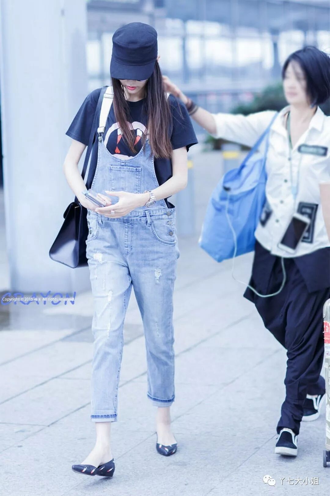 唐嫣真是非常热爱背带裤了,前面七七说过,背带裤不会下滑,对于腰长的唐嫣来说,也是福利。一条烟管背带牛仔裤,搭配深蓝色图案T,同色帽子,黑色挎包,黑色浅口平底鞋,少女感和熟女感统统都有,也是十分养眼了。 ▼