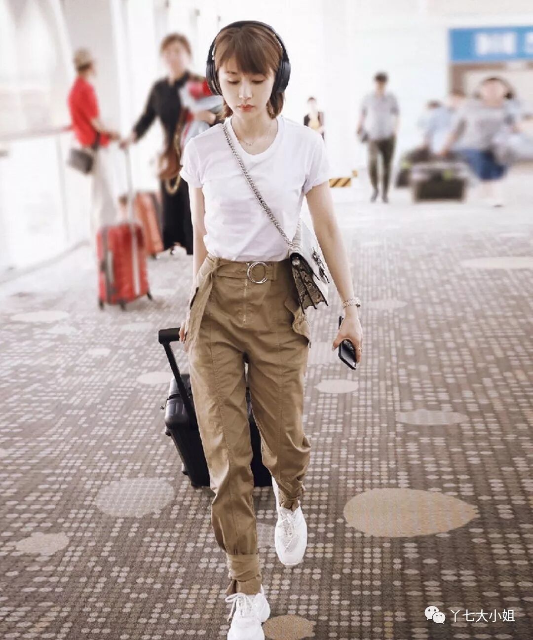 王子文虽然是小个子,但胜在瘦,身材比例好,衣品也不错,卡其色工装裤,裤腿设计了中缝线,裤脚绑带收口,腰上同款腰带,裤子稍宽松,但不至于太阔,很适合她的身材需要,上半身一件纯白T,浅棕短发跟裤子色彩也很搭,脚上白色运动鞋,配饰有耳机、锁骨链、手表、指环、蛇皮纹链接条,全身干净简洁,又很干练。▼