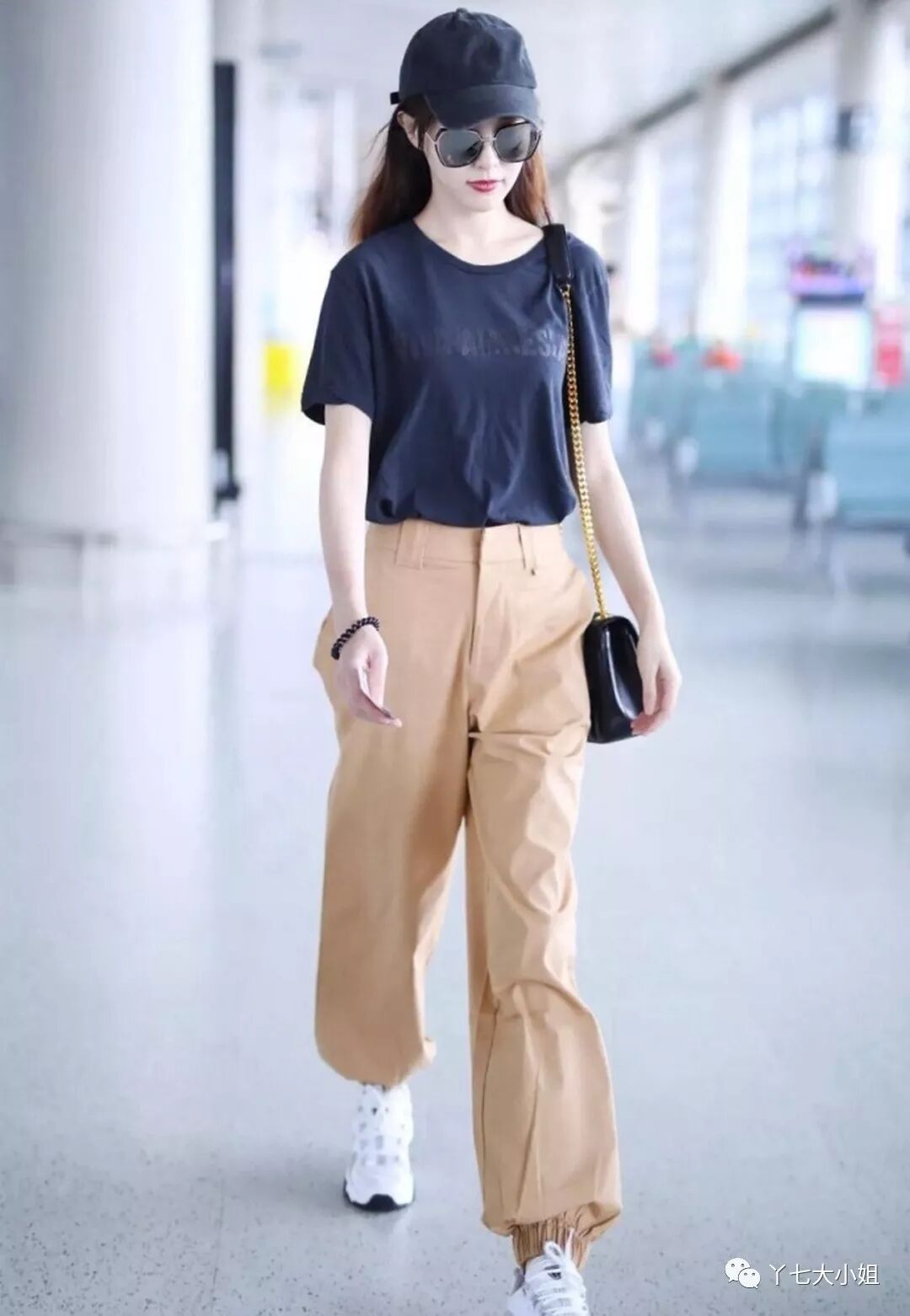 唐嫣这一套下半身选择的卡其色工装裤,裤脚扎口,脚上白色运动鞋,上身深蓝色T恤,头上棒球帽,大墨镜,长发,链条包,看上去很酷,但又不过于“man”,刚中带着甜,妥妥地酷girl一枚。▼