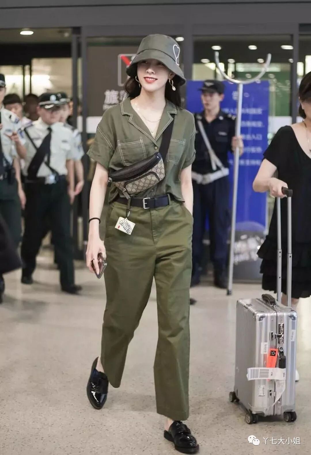这一件最普通款的军绿色工装裤,除了面料比较工装,其它的修饰都没有,就显得更加低调日常一些,不同年龄段的都可以穿。上身同款军绿色工装造型的短袖衬衣,军绿色渔夫帽,短款斜挎包,同色系搭配容易产生高级感,也更显简洁,配上黑色漆皮穆勒鞋,也是帅的不要不要的。▼
