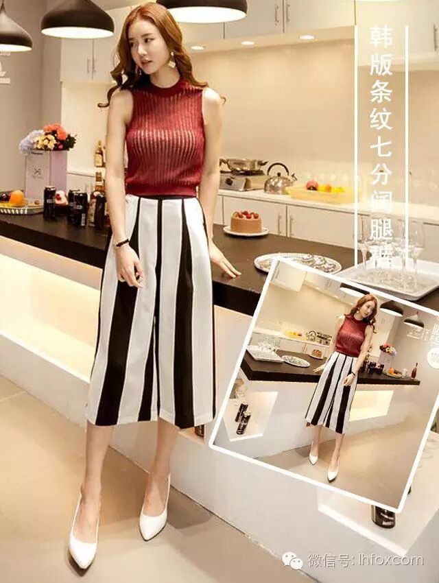 阔腿裤特别适合那些身材较为平板,有着小窄臀,身材瘦削的女性,它可以很好的掩盖过于瘦削而比例失调的胯骨和腿型。这款黑白条纹的阔腿裤,对于有着独具品位的30岁女性来说,这款集休闲、OL、轻熟风于一体阔腿裤,特别精致时尚。松紧腰的设计,收腰更加自如,七分设计,和宽松的版型,塑形美臀,显腿长。