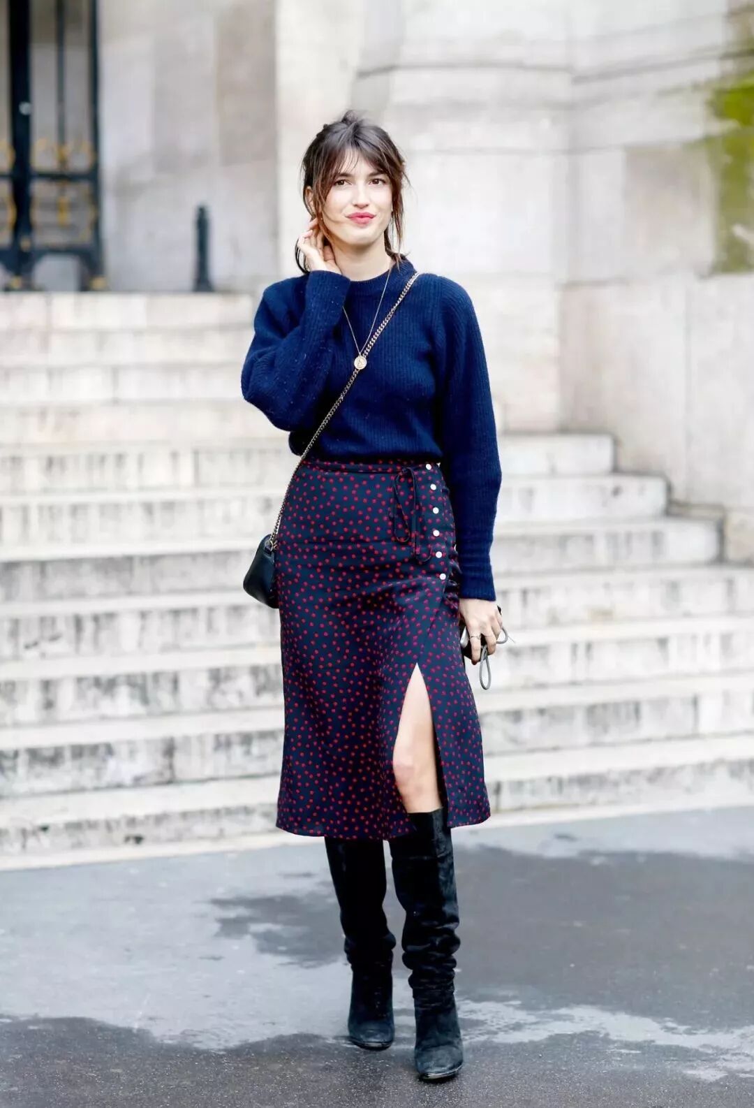 开叉裙和大破洞裤有异曲同工之妙,同样都是遮肉显瘦的利器,不过裙子相比于破洞裤的休闲感来说,更多了一些优雅。