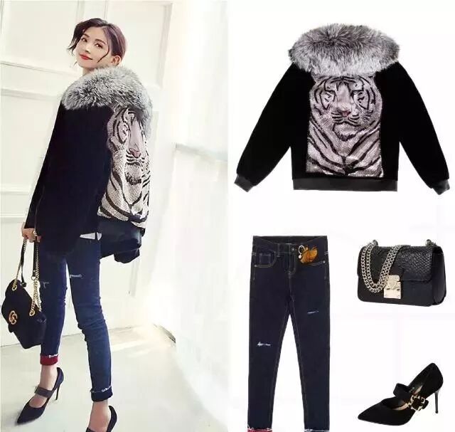 很喜欢这种刺绣的工艺,穿在身上很显精致,羽绒服是短款的,小个子也能穿,虽然是黑色的,但是因为上面有虎头的刺绣,也就显得很有时尚感,搭配一条黑色裤子,牛仔裤,紧身的款式,能很好地修饰体型,再搭配高跟鞋,黑色的尖头高跟鞋,整体显气质,又显瘦。