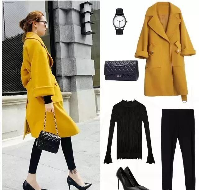 黄色大衣,还是比较少见的,毕竟常规的大衣颜色,无非就是米白色蓝色粉色之类的,所以这种黄色大衣,搭配好了还是很时髦的,衣服的前襟不是对称的,很有设计感,斜插的口袋,很方便实用,可以装东西,还可以天冷的时候捂手,里面穿黑色打底衫,荷叶领的设计,女人味满满,裤子的话选择黑色打底裤,修身保暖,很显瘦哦!