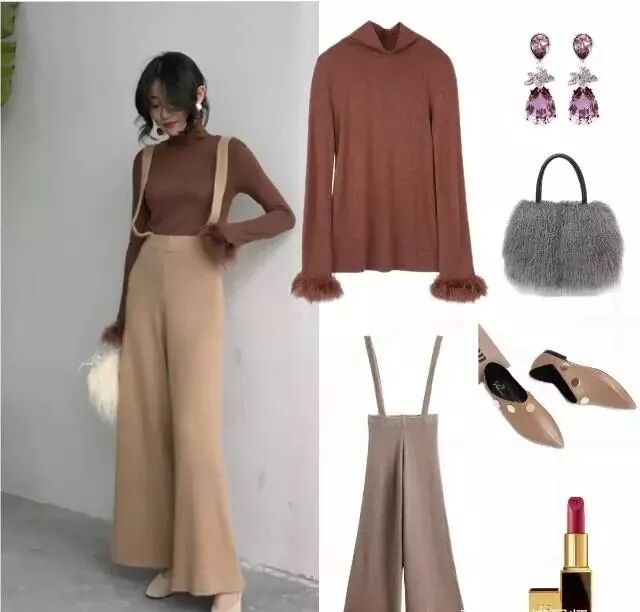 材质柔软的打底衫,咖色的,很柔软,显舒适,领口的立体感不是很强,所以不会显得很强势,而是儒雅的感觉,袖口是有毛毛装饰的,保暖又显气质,搭配背带裤,裤子是毛线的材质,垂度很不错,再加上比较厚实,也是很暖和的,鞋子就搭配尖头鞋,穿在脚上很显气质,还不会显得人老气。