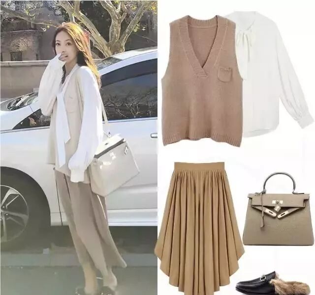 精致的女人,怎么可以不知道叠穿的技巧呢?白色的衬衫,领口是系带的,系成一个蝴蝶结,很有女人味,满满的少女心,搭配一件针织的马甲,针织材质的马甲,厚实又暖和,配上不规则的百褶裙,爱美的女人穿着特好看,而且叠穿的方法,特别的保暖,再搭配上一双平底鞋,鞋子上有毛毛,穿在大衣的里面,衬气质,又百搭。