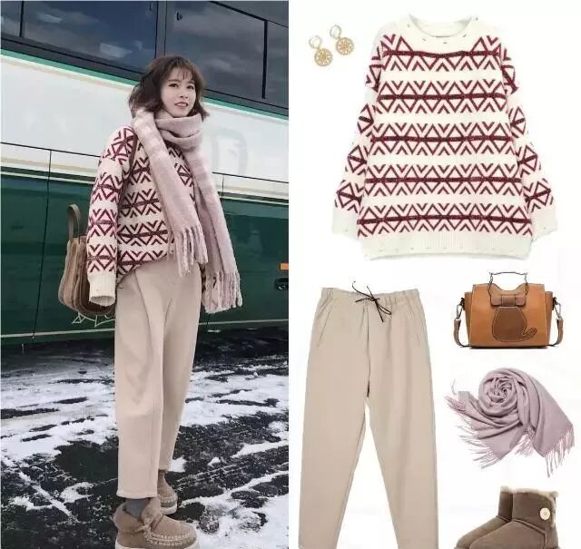 毛衣是白色的,上面有很多线条组成的菱格,时尚感很足,红色的线条在白色的衣服上,很是和谐,毛衣是圆领的,领口比较大,搭配围巾比较暖和,裤子的话,是搭配的呢子裤,裤腰带上有系绳的设计,很合身,搭配一双雪地靴,保暖又耐看,不知道冬天,过年的时候,还有走亲戚的时候应该穿啥的,能试一下这身内搭哦!