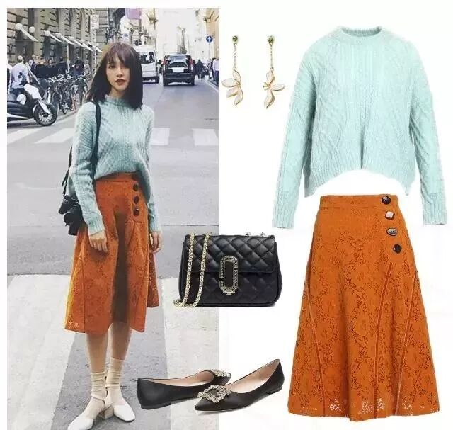 上身是湖蓝色的毛衣,上面有很多花纹的装饰,很显精致,淡淡的颜色,因为比较亮,穿在身上很显白,小圆领,保暖又不会扎人,再搭配一条裙子,麂皮绒的材质,侧面有一排纽扣,扣子是黑色的,质感很不错,加上裙子上有立体花纹,显高档,搭配一双白色长袜+黑色平底鞋,百搭又很耐看。