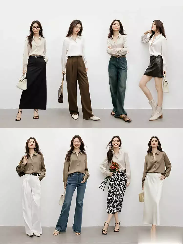 穿搭案例:以经典的白色棉质衬衫为例,挑选略微修身的设计,搭配高腰直筒裤。解开顶部一两粒扣子,轻微挽起袖子至肘部,不仅随性而且拉长了颈部线条,使整体造型简洁利落,适合多种场合。