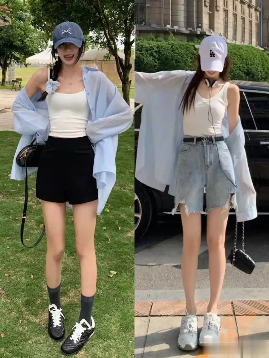 穿搭案例:尝试一件小V领的蓝色条纹衬衫,配一条简约米色短裤或短裙及同色系凉鞋。V领设计使颈部线条更加修长,条纹元素具有视觉延伸效果,显得人更加挺拔。此时,将袖口卷起两折,露出手腕,配一块简约手表,既商务又不失个性。