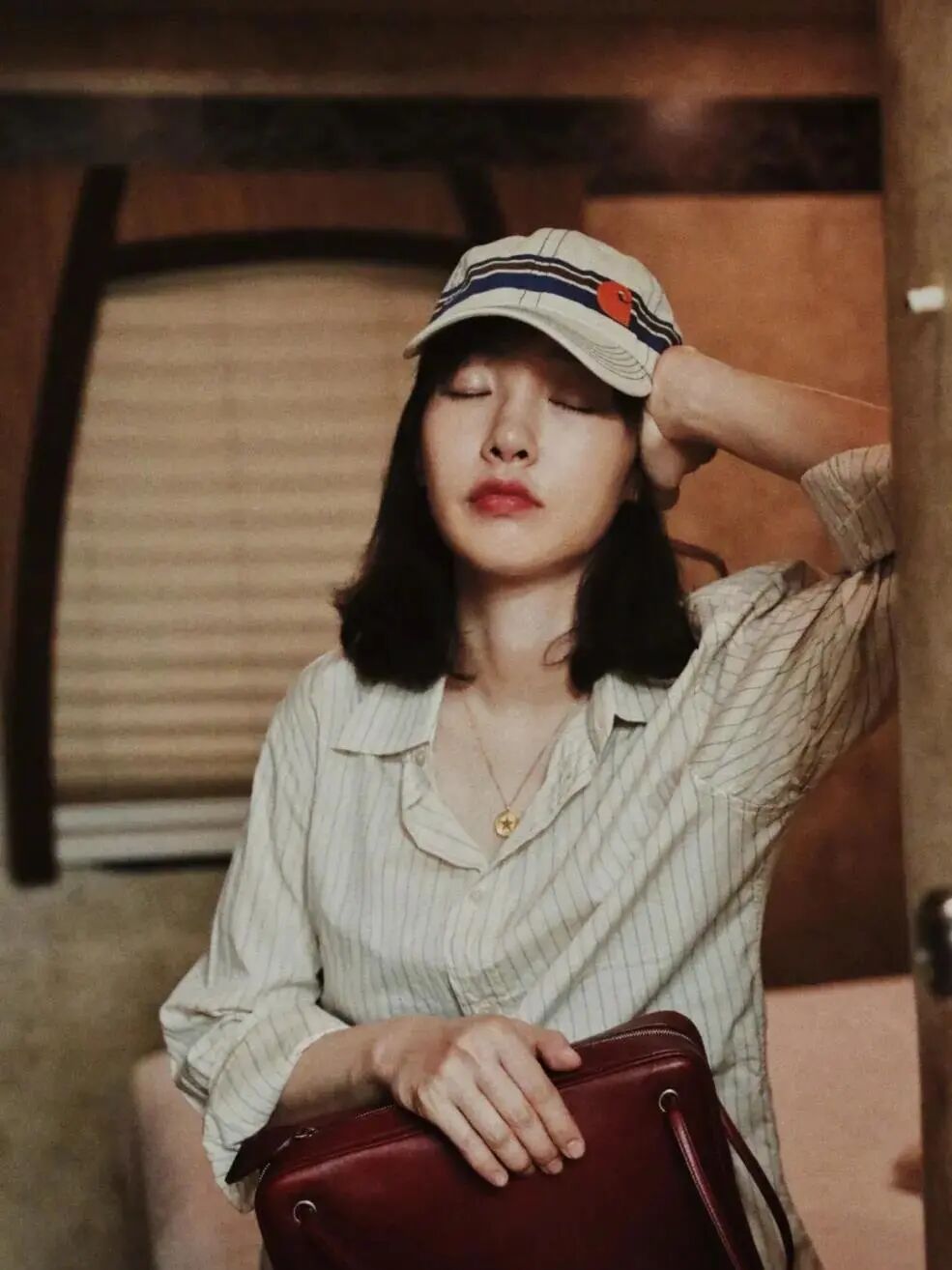 深色大衣更日系,蓝色围巾十分提气色。白百何有很多只中古包,这只是 Vintage Prada 的小牛皮手提袋。