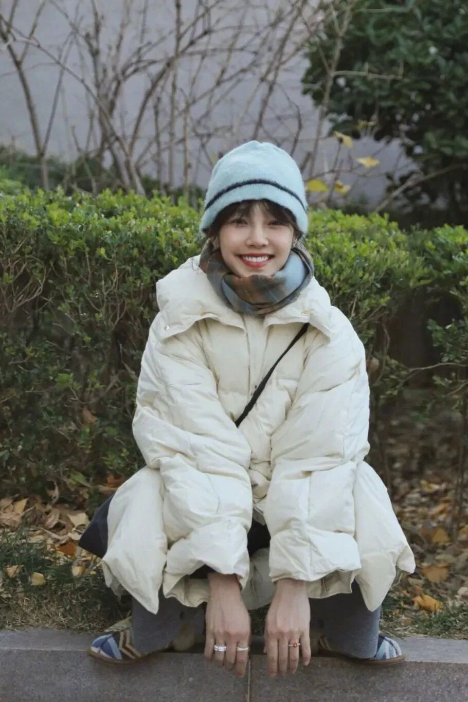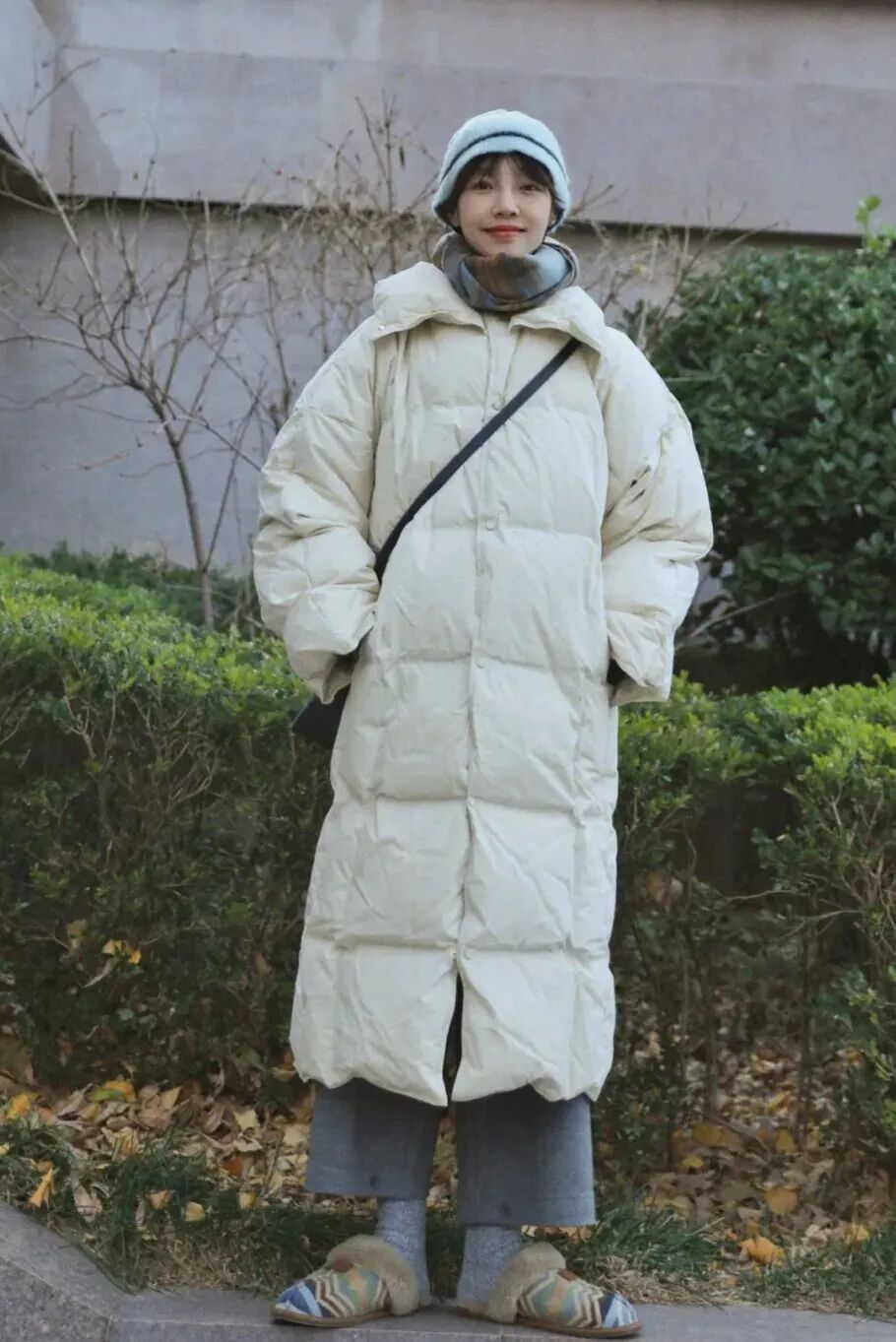 白百何的最温暖的 look 是这套长款羽绒服穿搭,灰白色是主色调,羽绒服来自 Bottega Veneta,UGG 民族风棉拖与 Low Classic 格纹围巾花色相呼应。