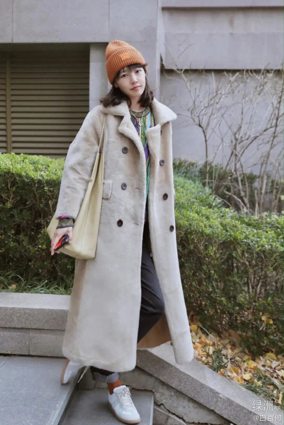 白百何将灰白两色都收入囊中,用跳跃色的耳环、帽子化解外套的厚重,不会给人透不过气的感觉。