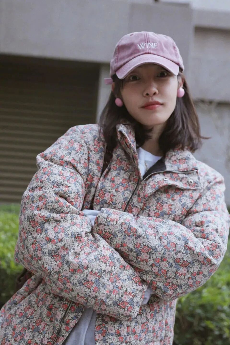 第二套羽绒服 look 是一件 Gucci 碎花羽绒服,搭配同色系的耳环、棒球帽,重点集中在上半身,又是一个显高小妙招。