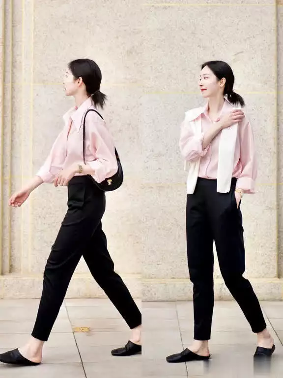 这样的衬衫更显清爽,而且粉色衬衫和黑色长裤的搭配也相当的显瘦,即便只是很基础的单品,但是这样的穿搭却仍然非常的时尚增高。