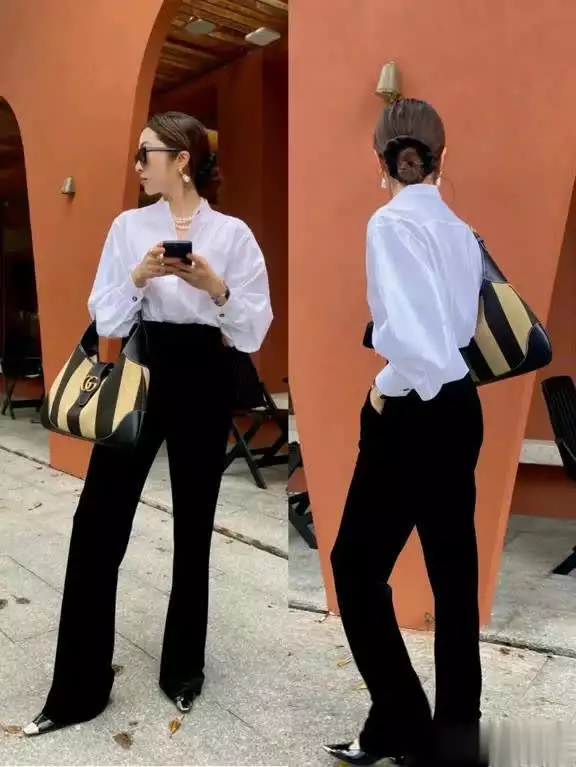 黑白配色真的很经典,如果你没有搭配思路,我就建议你去尝试这种黑白配色的穿搭,尤其是上班通勤的时候,你可以考虑这种白衬衫和黑色高腰裤的穿搭。