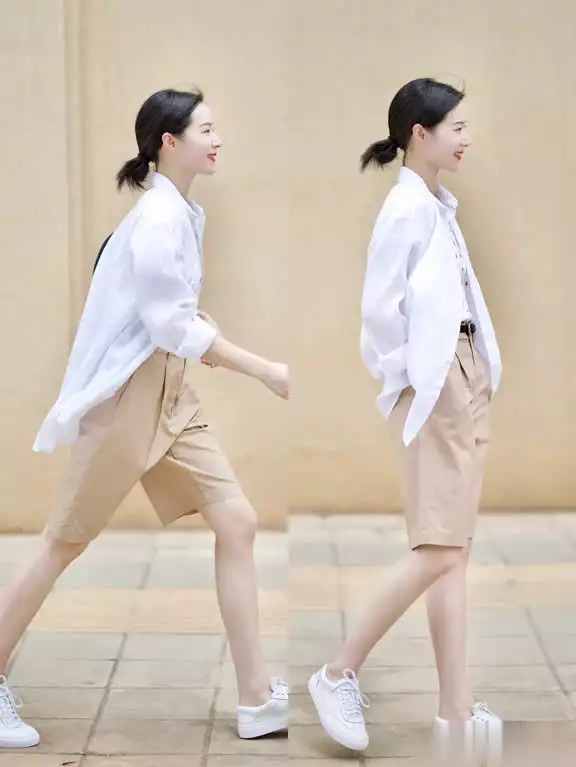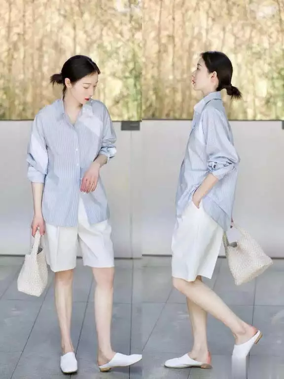 如果你想穿的清凉一点,那么你可以尝试这种衬衫短裤的搭配呀,短裤或者是短裙露出我们的腿部曲线,这样的穿搭会显得更清凉。