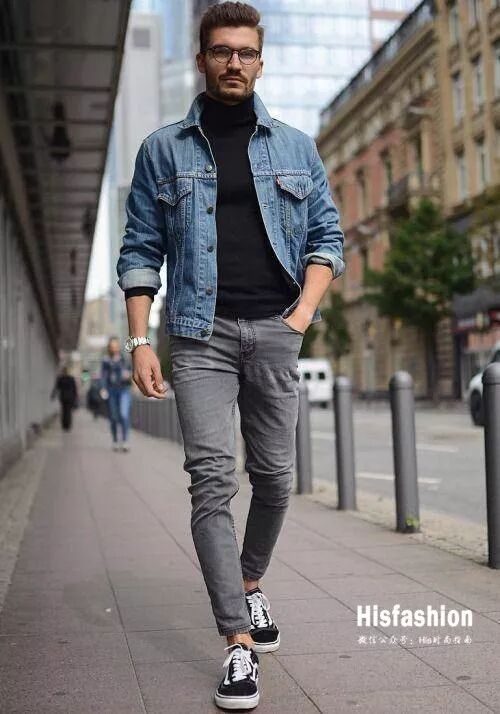 灰色高领毛衣总是带来品质感,搭配绿色简约版夹克效果非常的不错。蓝色牛仔裤和小白鞋一穿,简直就是韩剧里的时尚欧巴。