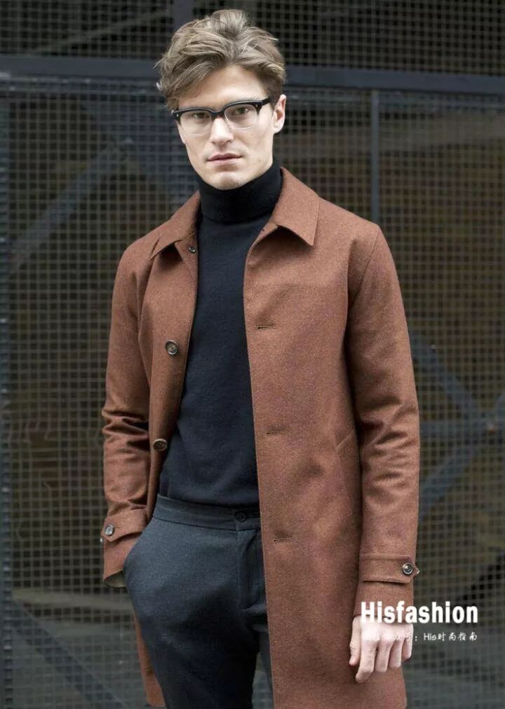 利落笔挺的大衣搭配高领毛衣,非常容易穿出韩剧男主角一般的自信男人味道。不过,为了看起来不那么严肃和古板,应该避免内搭衬衫、西装背心和西装套装这种套娃式的叠搭组合。