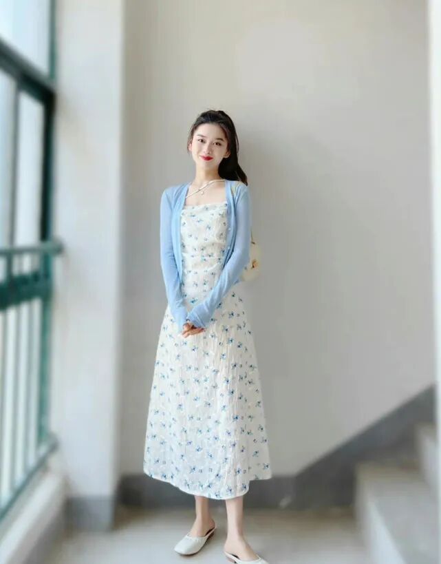 针织开衫的百搭属性虽然不强,但是与连衣裙的搭配可谓是天作之合,特别适合女教师选择,一副温柔优雅的样子,提升气质的必备。