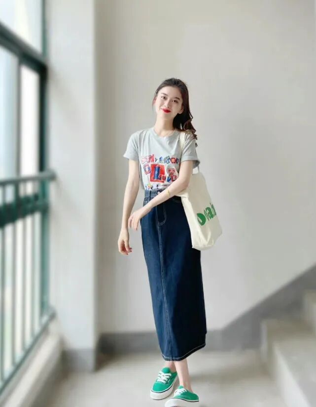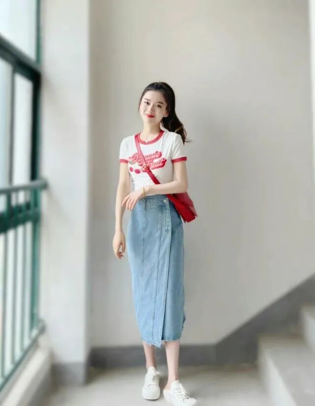 第二种:印花T恤衫+牛仔裙。T恤衫也是休闲单品,比起衬衫更加方便不容易走光。
