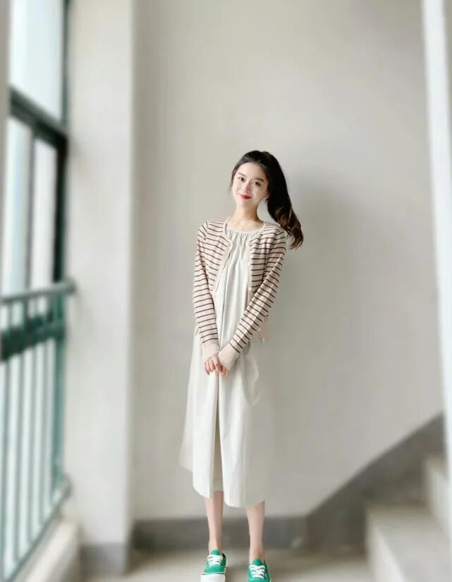 反向选择也是上分,比如条纹针织衫也可以搭配纯色连衣裙,用条纹和宽松搭配出文艺范,看起来更加优雅更加气质。