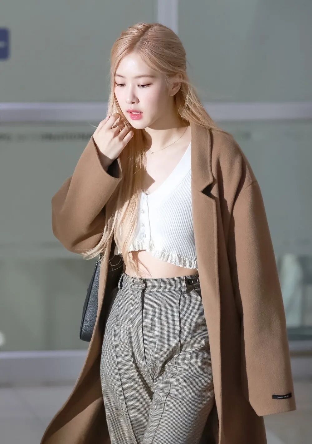 要想看起来更优雅,你可以试试Rosé的v领针织短上衣搭配经典的驼色大衣。这身搭配看起来十分迷人和优雅。