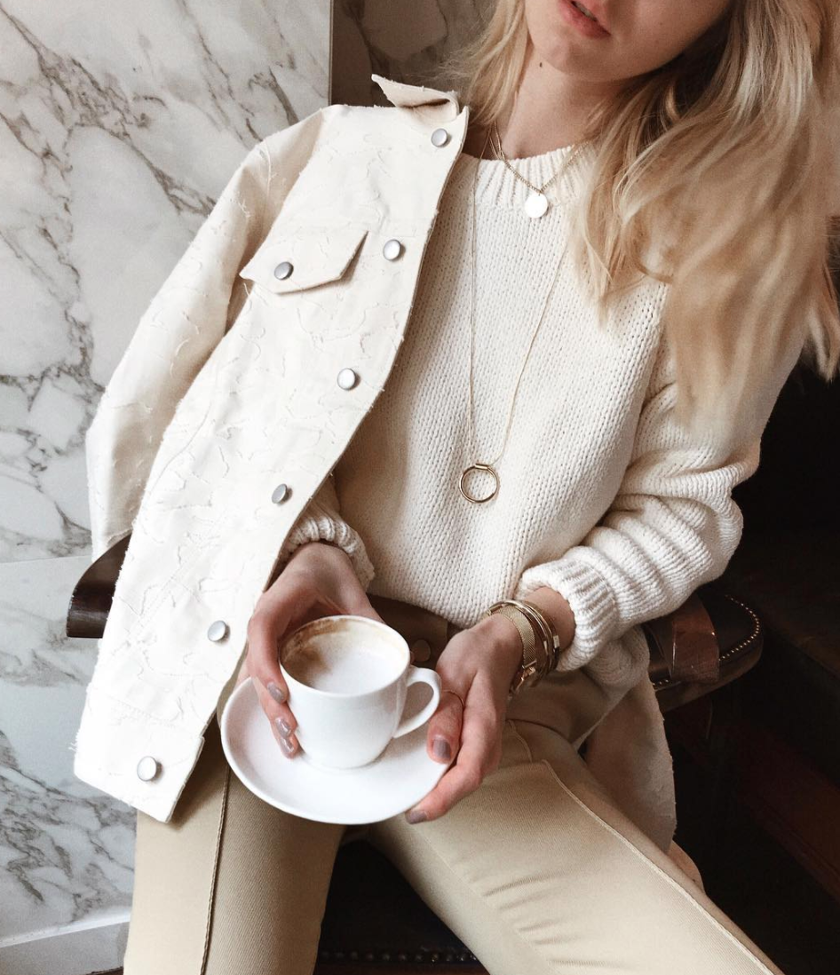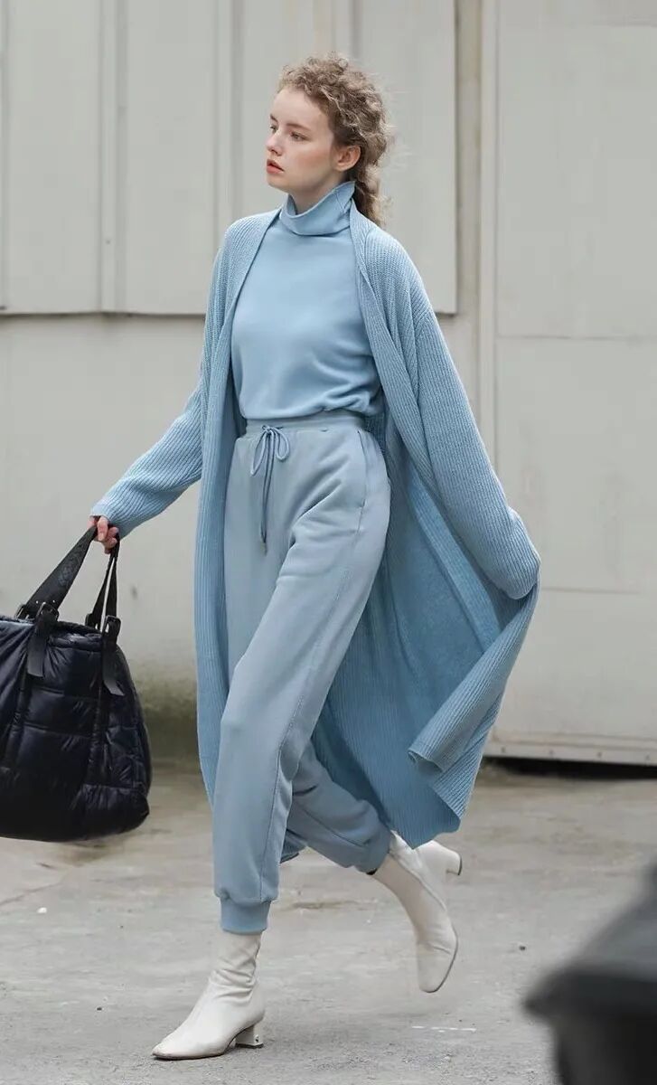 有时候,你会觉得太冷了,根本没有精力搭配服装。如果这样,你可以学学珍妮,试着穿成单色(整套Look只穿一种颜色),用不同的色度搭配。看起来可爱又舒适,对吧?