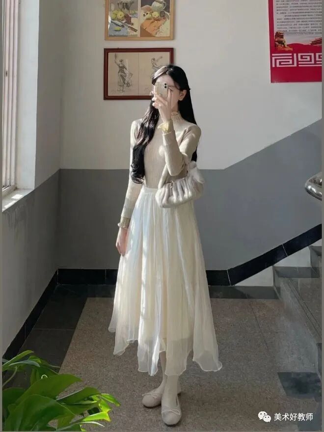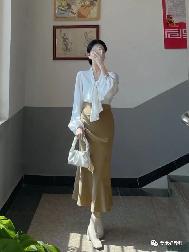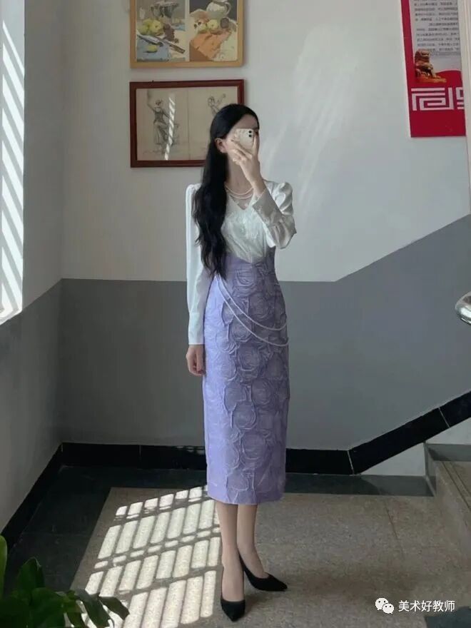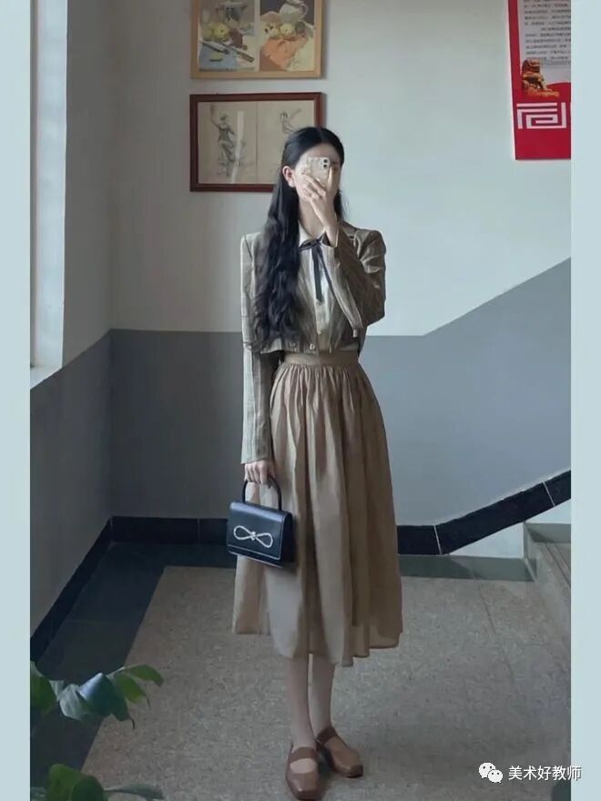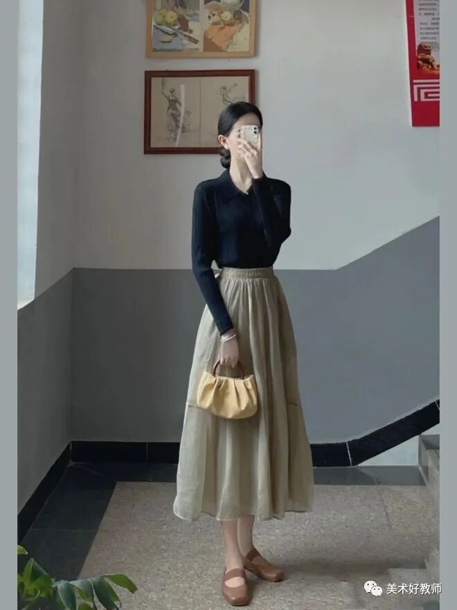 穿搭小tips :学校对于老师的穿搭虽然有要求,但是这并不影响美术老师在穿搭上的发挥,并且能把简单的衣服也可以穿的漂亮大方。要想把衣服穿着有气质可以选择纯色进行搭配,颜色虽然简单但是上身效果却十分好看。其实好看的穿搭并不需要太多花里胡哨的点缀,反而简简单单的会得到更多人的认可。也可以用一些包包或者饰品来对穿搭进行一个点缀,也可以起到一个加分效果。