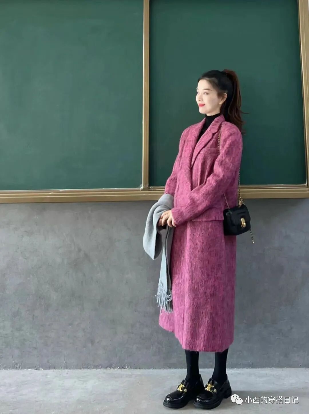 在寒冷的秋冬,换一种颜色,也许就能换一个心情。玫红色的大衣,如同秋天的枫叶,鲜艳而热烈。而那灰色的围巾,就如同一个温暖的拥抱,给人一种安全感。穿上它,仿佛整个世界都变得温暖起来,让人心情愉悦,充满期待。▼
