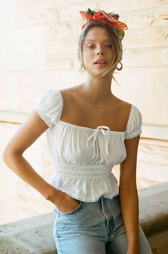 再来就是今年特别流行的“挤牛奶女工”上衣,特点是方领或者鸡心领,领口开的比较大,配上花苞袖,整体甜美又有女人味。