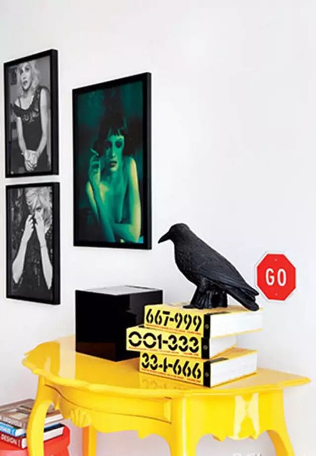怪诞也是波普风格的另一种延续,鲜黄色的条案上放置着有点诡异的黑鸟摆件,墙壁上还有三幅耐人寻味又带点诡秘的画作,略带暗黑的风格与鲜黄色的条案形成鲜明对比。