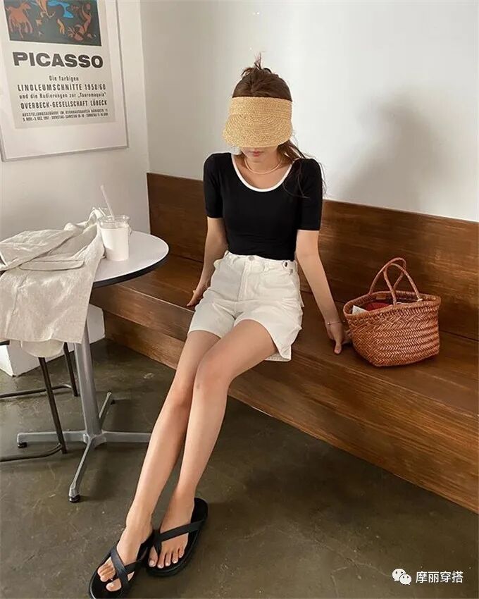 黑色自带沉稳属性,加之色彩优势,能够模糊身上的肉感,达到显瘦的效果。但纯色T恤太单调,来点撞边会更有新意。白色撞边强调宽大圆领,凸显略带骨感的锁骨与白皙皮肤,不经意间增添了几分优雅气质。