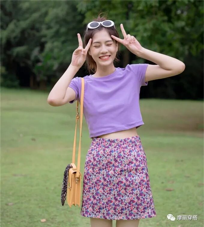 在这个假期,你要与风景美得旗鼓相当,得穿得够靓才行。紫色短款T恤,露出小蛮腰,青春有活力。紫色碎花短裙很明媚,虽然色彩多,但是很协调。与上衣相呼应,让造型更统一,简直就是“多肉葡萄”,甜美感超足。